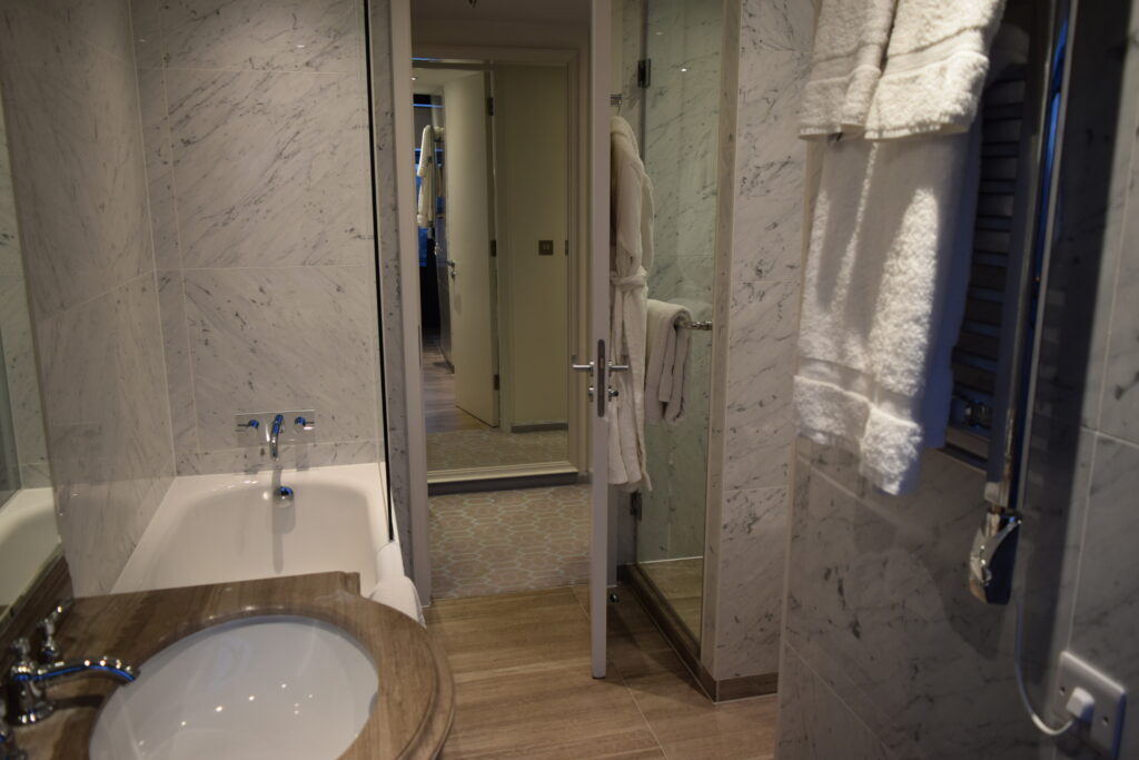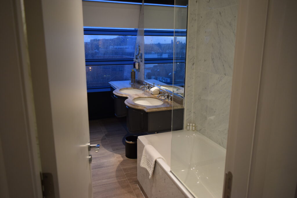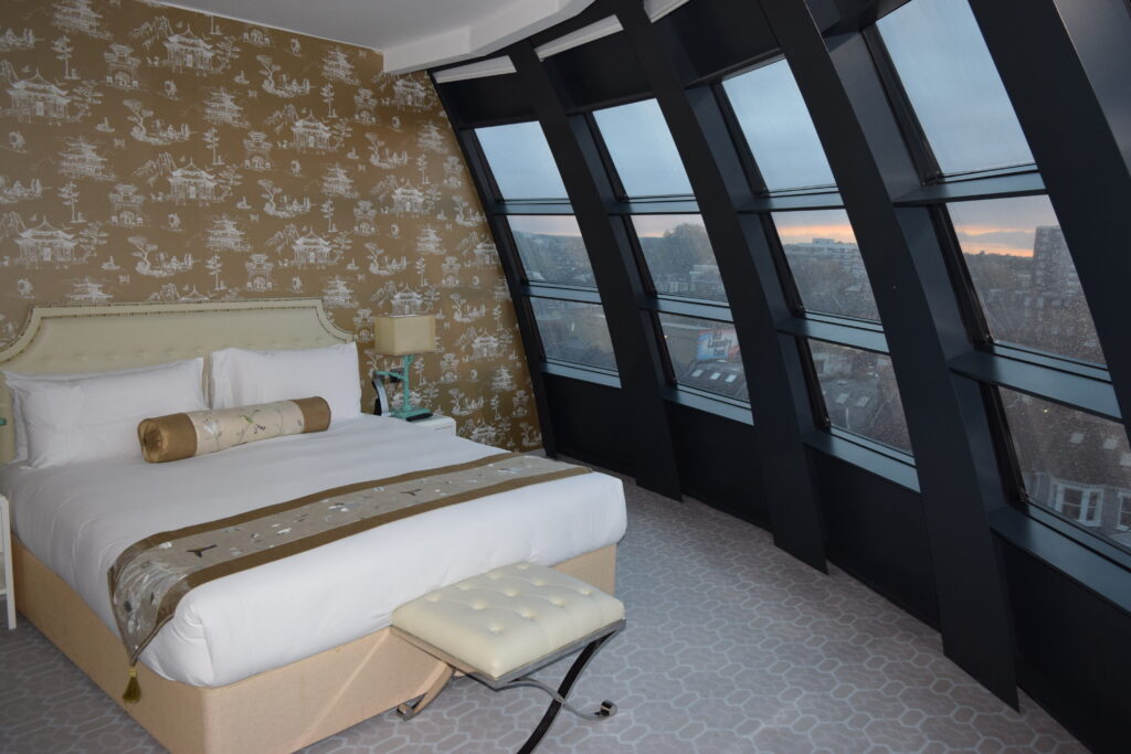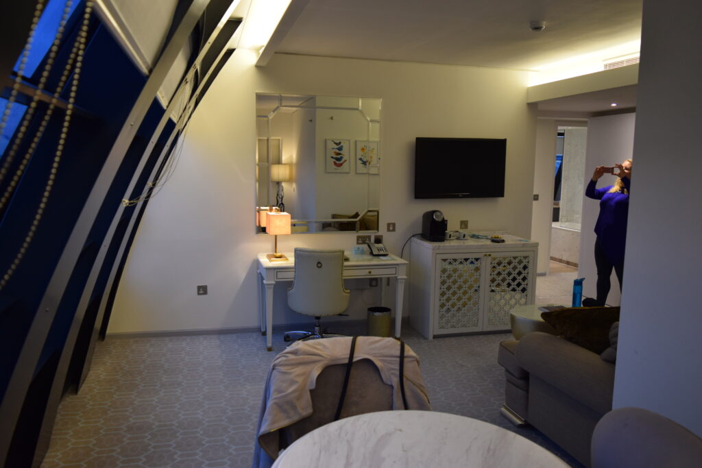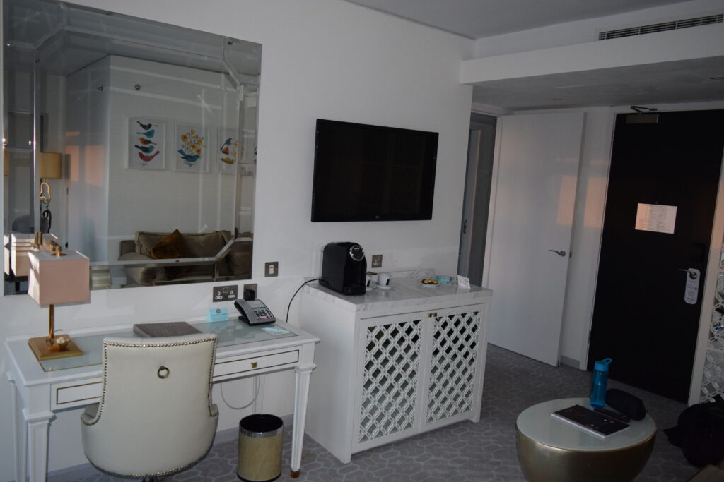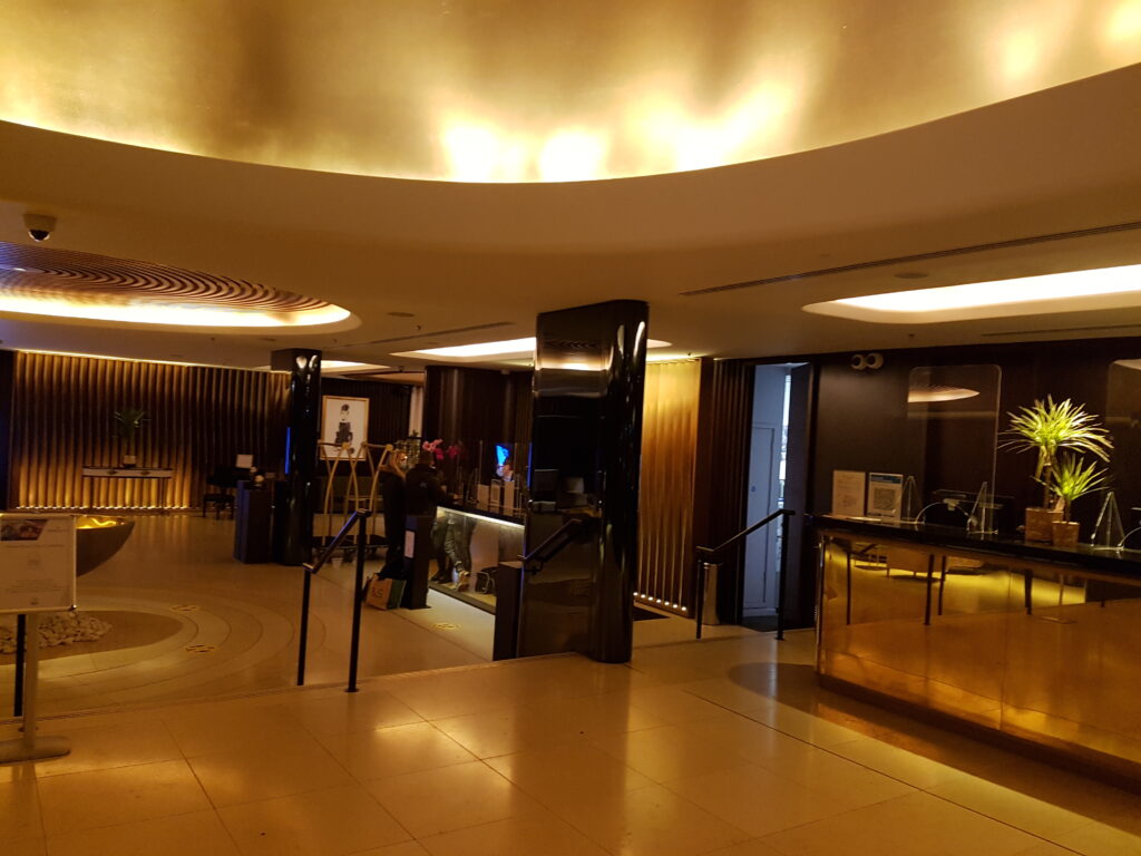After we explored a small part of London, namely Harrods then the Houses of Parliament, Number 10, Horse Guards and then the royal mile, (all were easy to get to and gave us hours of fun and entertainment) we returned to the hotel. Stopping at the Sainsbury’s local across the road for some room treats we were set for the night. Walking through the hotel door, the foyer impressed us again. It had not lost any of its sparkle from when we had first walked in. Even the massive gold bath, in the middle of the reception area made me smile. The lighting had changed as it was dark outside and the area was asking to be enjoyed. However due to all the Covid restrictions, the small bar area was closed. It was a real shame as I could have happily sat there for an hour taking in the view and sipping a cocktail or two. Instead taking the Sainsbury offering up to the room, we got to enjoy the room for the evening.