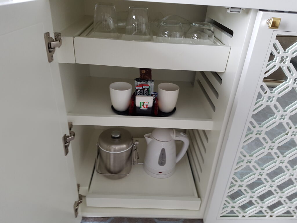 Backing out of the bathroom, and in the corner was another door. This was the link door into the adjoining room. After unlocking both sides of the door we had a two bedroom apartment, on the seventh floor of a classy hotel. The second room was much smaller, but it had everything that we needed. The bonus was that the link door gave access to suite and the huge lounge area, which allowed the family to be together.