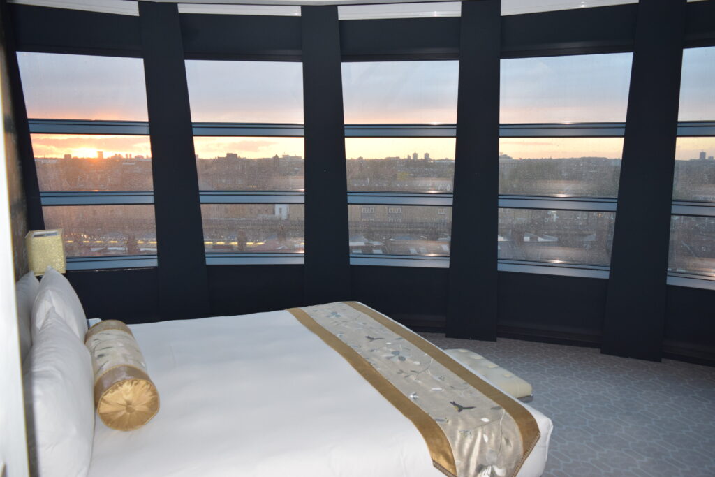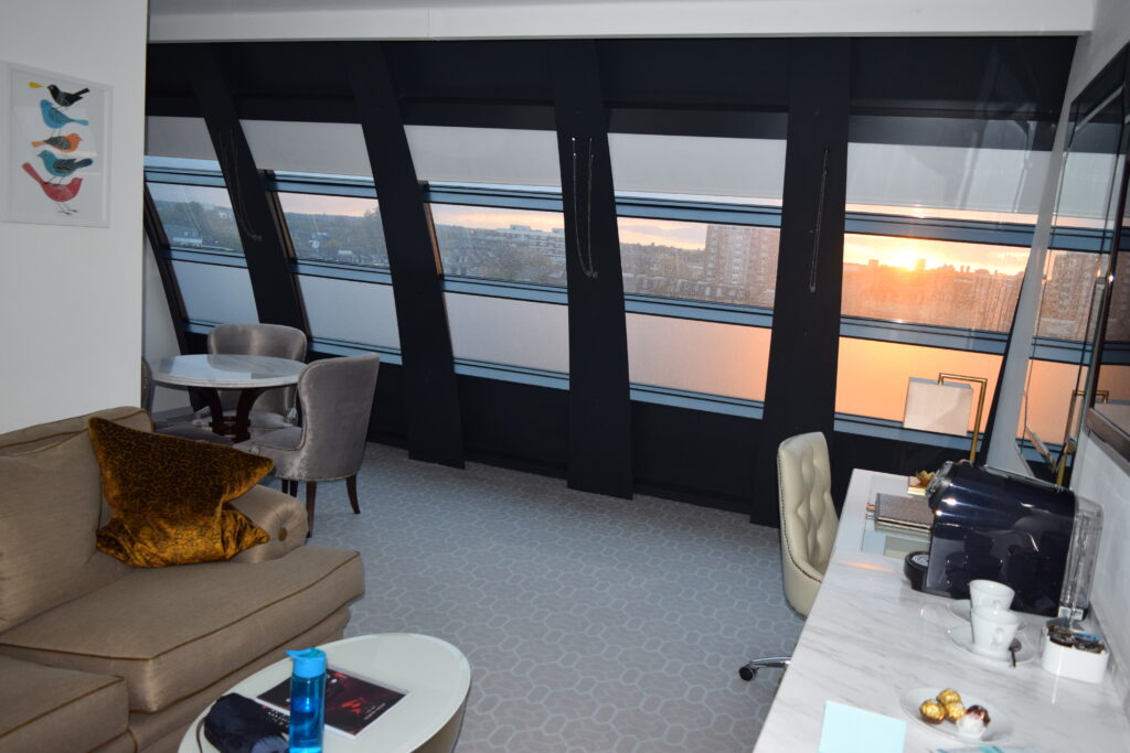 Finding our room at the end of the hallway, the room card granted us access and the door swung open. Stood on the threshold, looking in, the sight was jaw dropping. The beautiful lounge area, opened onto huge windows that ran the length of the room. With the sun setting right in front of me, London’s skyline was breathtaking. With a sofa, TV, coffee machine with a table and chairs set out there was still room to spare.