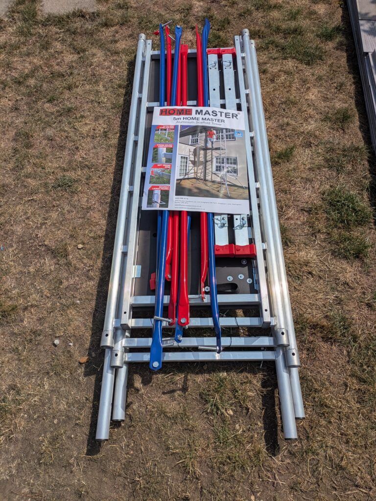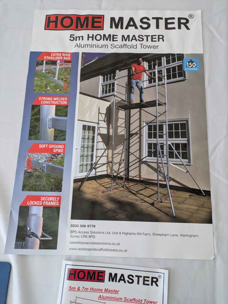 In the current climate, the cost of hiring a professional is prohibitive, so what’s the answer? Well, I found Home Master, a company called BPS in the UK that builds and sells DIY scaffold towers. And as this winter is supposed to be a bad one, my guttering cannot wait, so I ordered a 5-meter tower and my luck was in, as they had a sale on!